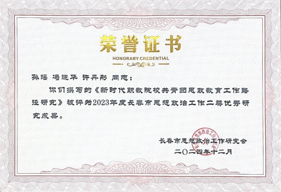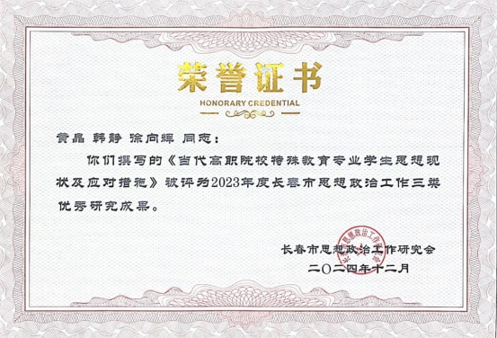 近日,由长春市思想政治工作研究会主办的2023年度长春市思想政治工作优秀研究成果评选活动结果公布,公司孙瑶、冯晓华撰写的《新时代职业院校共青团思政教育工作路径研究》被评为“长春市思想政治工作二类优秀研究成果”。黄晶、韩静、徐向辉撰写的《当代高职院校特殊教育专业员工思想现状及应对措施》被评为“长春市思想政治工作三类优秀研究成果”。